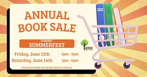 Join us for our much-loved Annual Book Sale during Summerfest! Browse a wide selection of gently used books and AV materials at great prices. You'll also find library merchandise—including t-shirts, sweatshirts, and reusable bags—available for purchase. All proceeds support the library. We accept cash, cards, and checks. Don’t miss this chance to stock up and support your local library!